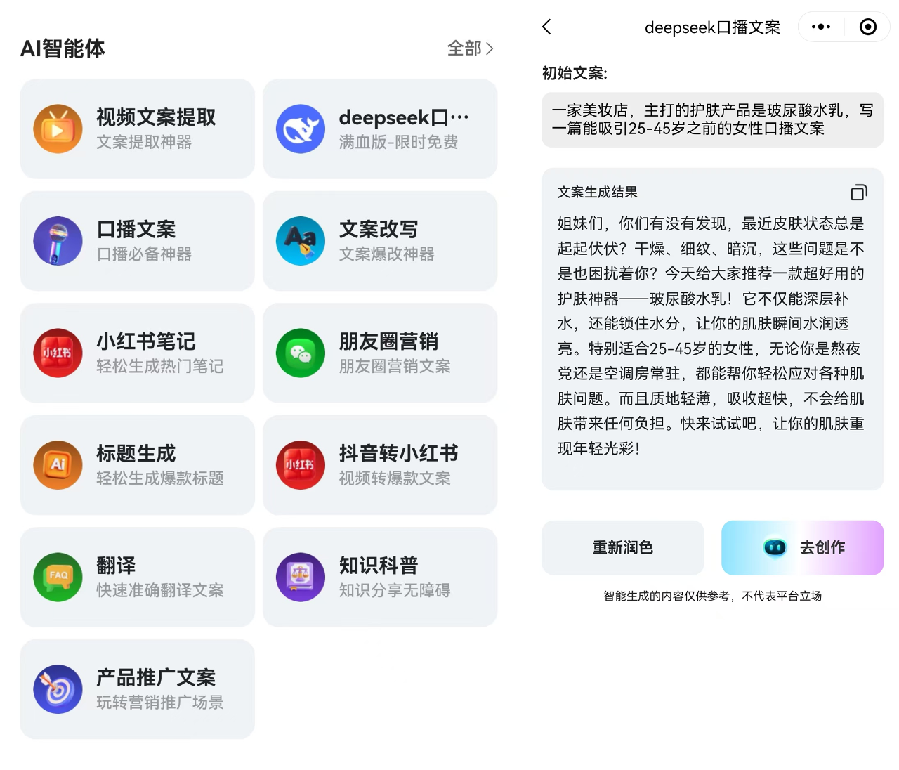 2、AI文案生成: 内置DeepSeek-R1满血版AI模型,为您快速生成专业、吸引人的视频脚本,解决文案创作难题。