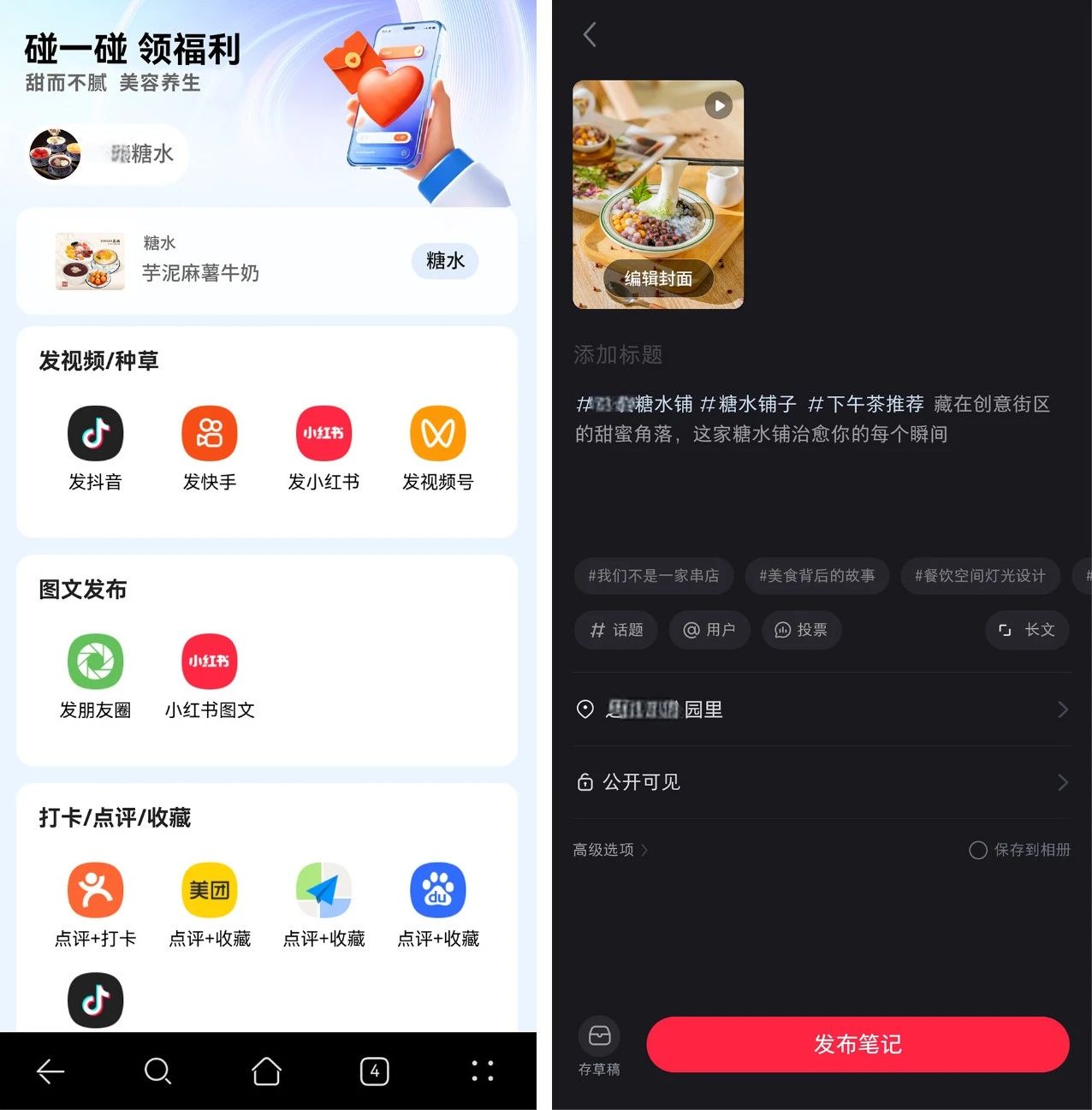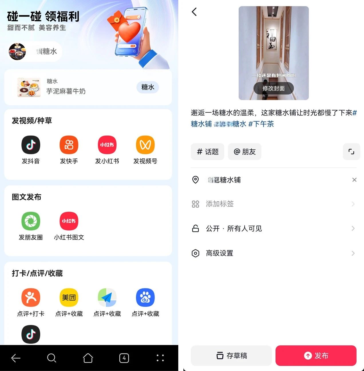 • 功能价值:通过自动生成的探店视频,用户碰一碰就能自动发布,帮助商家做店铺曝光的同时还能快速吸引用户的关注。