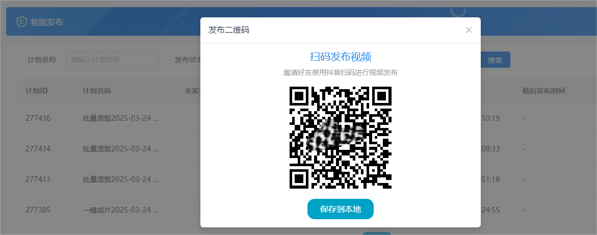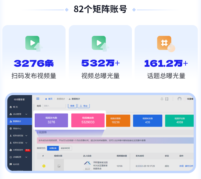 • 矩阵发布与扫码发布:矩阵发布功能允许商家预设视频素材和发布任务,授权账号按设置自动发布;扫码发布则为商家生成独立二维码,用户无需绑定账号,扫码即可转发视频,操作便捷,快速实现传播。