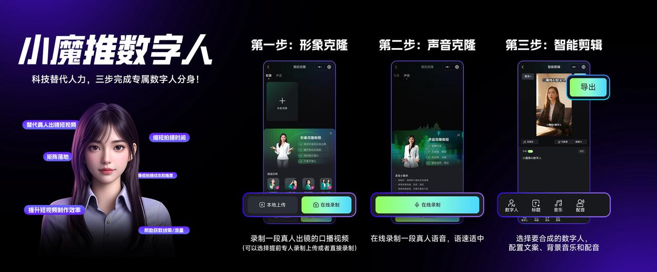 小魔推AI数字人: 作为餐赞自主研发的拳头产品,集成了尖端的AI虚拟形象技术、声音克隆、智能剪辑及智能文案生成能力。它不仅能为客户构建独一无二的虚拟人形象资产,更能通过AI驱动实现多模态交互,广泛应用于各类营销与服务场景。