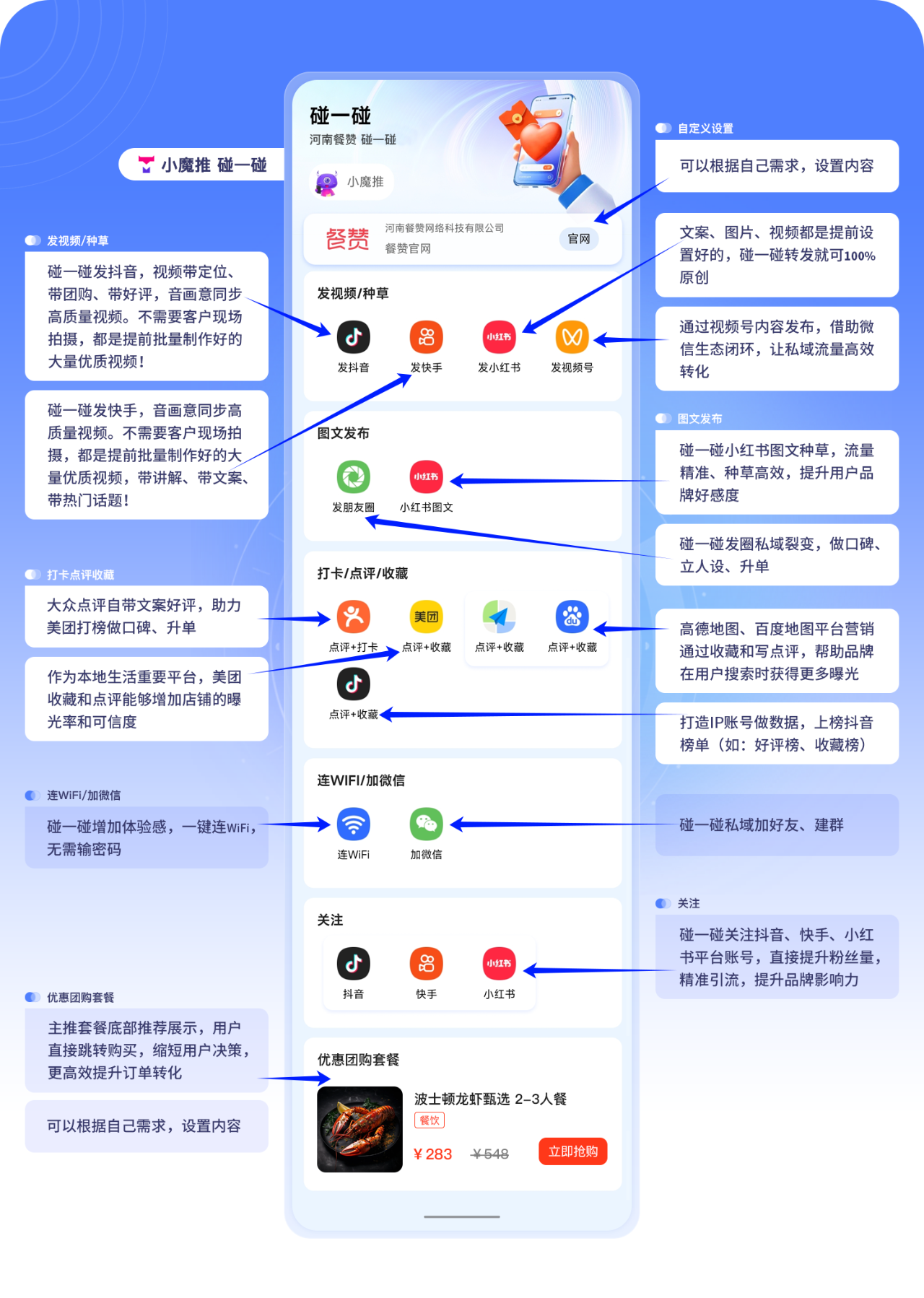 顾客用手机轻轻一碰桌面上的小魔推碰一碰桌卡,AI就能自动生成专业的探店短视频和吸睛文案,引导顾客一键分享到抖音、小红书、快手等平台,瞬间引爆社交传播,为您的店铺带来海量曝光!