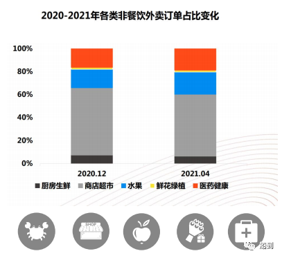 再加上用户在疫情中逐渐养成的零售消费习惯,水果及医药健康类非餐饮外卖业务占比正在不断扩大,外卖已开始逐步撕掉“餐食”的标签。