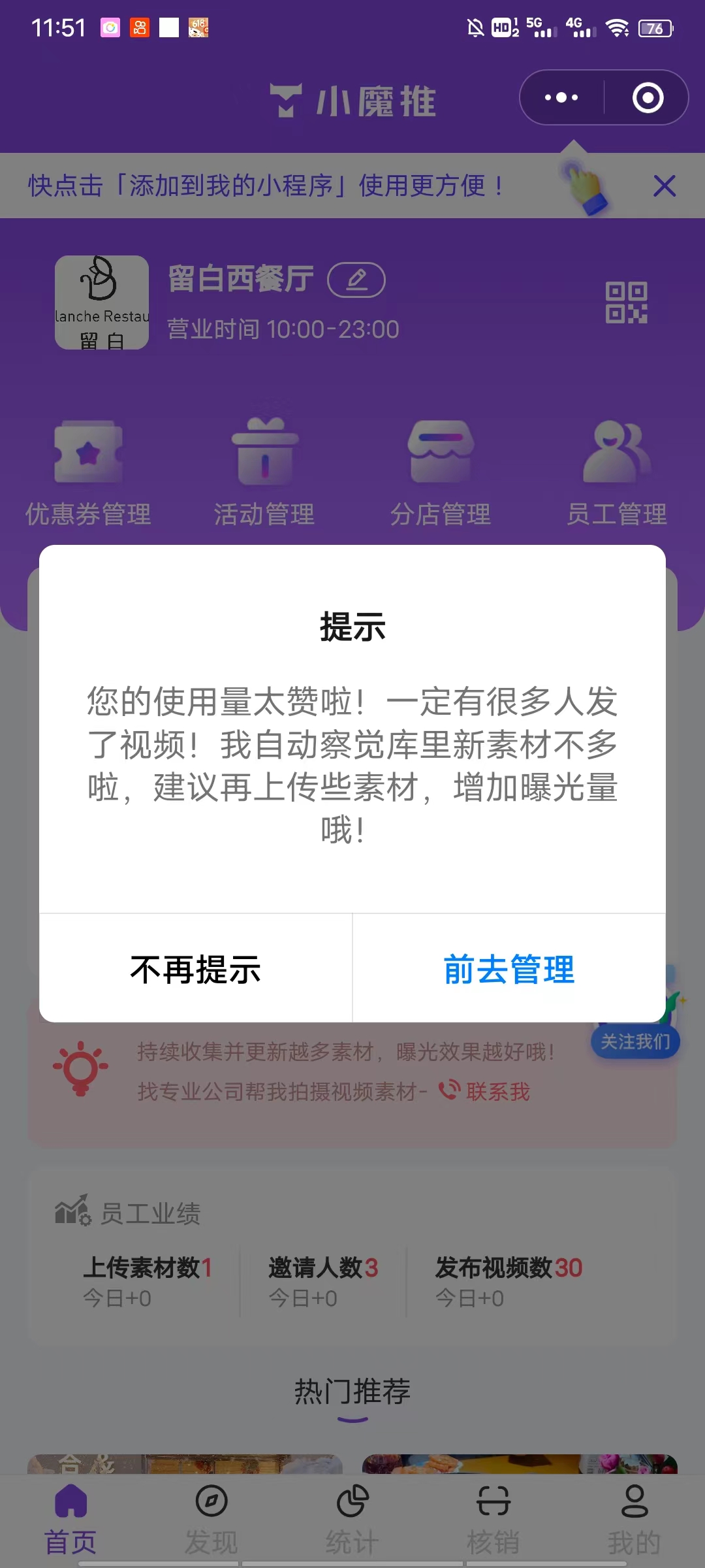 小伙伴们,首先我们要了解的一点是,小魔推它是完全不需要顾客进行转发或者视频发布的动作,它是在客户领优惠券情况下把视频转发出去的。商家还可以跟客户说一下,视频保留3天,再到店里消费我再送你一个小菜。老板既获得流量,还能增加一单收入。