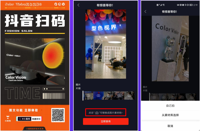 可以像发朋友圈一样在短视频平台里发布图片,后台自动匹配音乐、配音和贴纸特效。