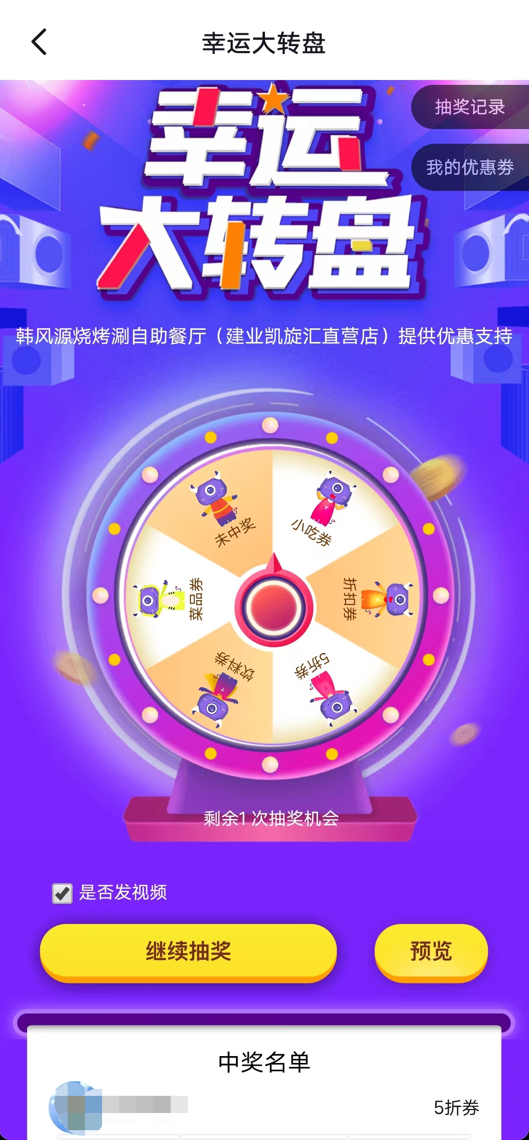 大转盘是小魔推后台的一个营销功能,可以结合商家的活动来使用,在后台开启大转盘,设置大转盘活动内容,就可以以大转盘抽奖作为噱头去邀请顾客参与扫码发视频赢大奖。