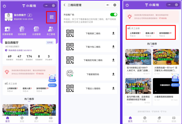 入口清晰明了,在商家端手机后台专设发现栏目,用户在首页就可看到热门推荐视频,点击设发现即可进入子菜单查看栏目的各种有助于小魔推运营的内容干货;形式丰富多样,栏目汇集视频、文章、案例、拍摄教程、热门素材、动效、音频、评论等多种形式的运营技巧和营销玩法且后台会不定时更新,以保证内容及形式的新鲜度和实时性。内容充实实用,栏目里的内容都是由运营团队从众多成功商家里筛选总结而来,是真实落地成功的经验总结而来,内容充实且实用。餐饮大V助力,小魔推特邀的餐饮行业大V的行业分析和解读。打造真正能帮助商家运营的行业干货内容。