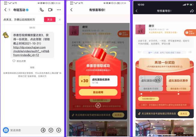 用户通过小魔推扫码发布视频,视频播放量达到奖励标准即会触发此功能,后天就会通过商家企业账号发送私信通知用户,对用户进行二次触达,拉升复购,增加用户黏性。