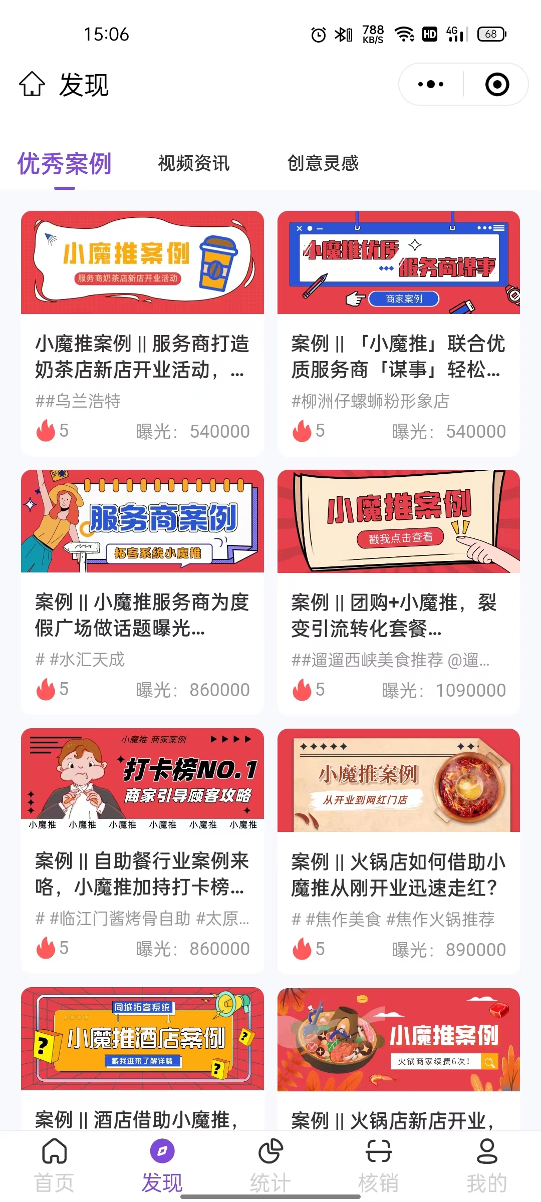 短视频获客系统小魔推商家手机端栏目之一,内含优秀案例、视频资讯、创意灵感多内容供商家学习和使用。