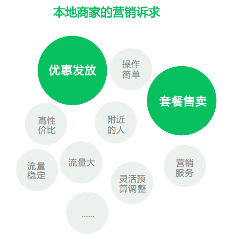 结合商家的痛点来说,他们营销诉求包括了流量大、流量稳定、附近的人、营销服务、操作简单、高性价比、优惠发放、套餐售卖等等。