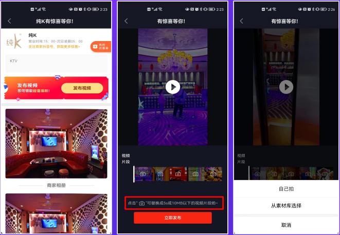 1、商家预设优惠活动、推广视频、宣传文案、标签、商家地址定位等系列信息,通过系统后台,一键生成发布到短视频平台。