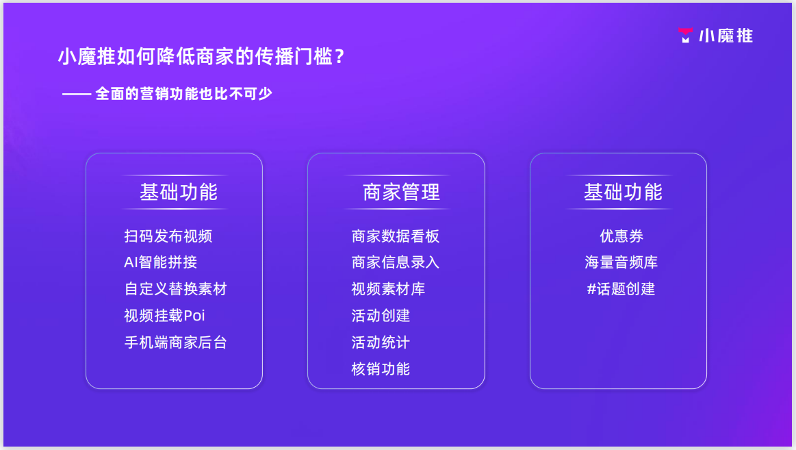 如何降低商家的传播门槛,那小魔推全面的营销功能也必不可少。