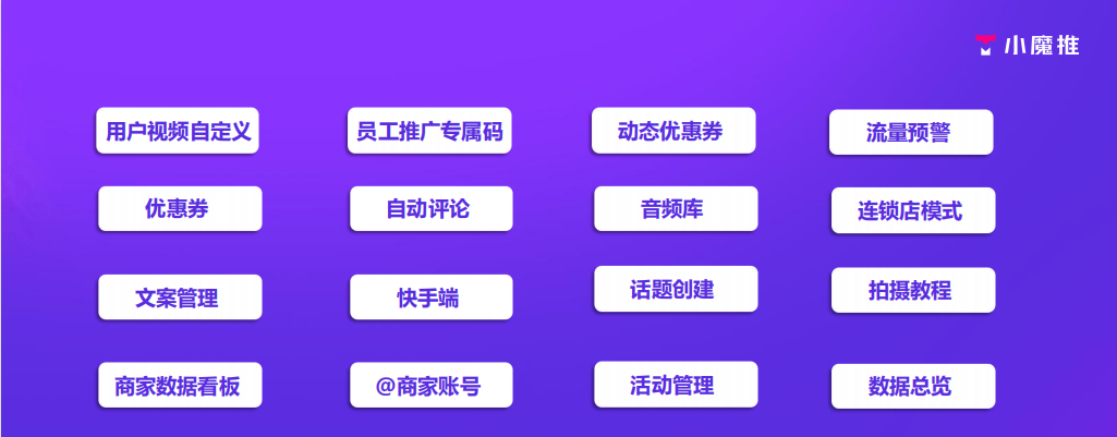 小魔推不仅仅是一款扫码拼接视频的系统,更是内含了丰富的营销功能,包括动态优惠券——提高视频留存率、用户视频自定义——用户个性修改素材片段提高曝光度、连锁店模式——方便连锁品牌统一管理,等等多种功能和玩法。