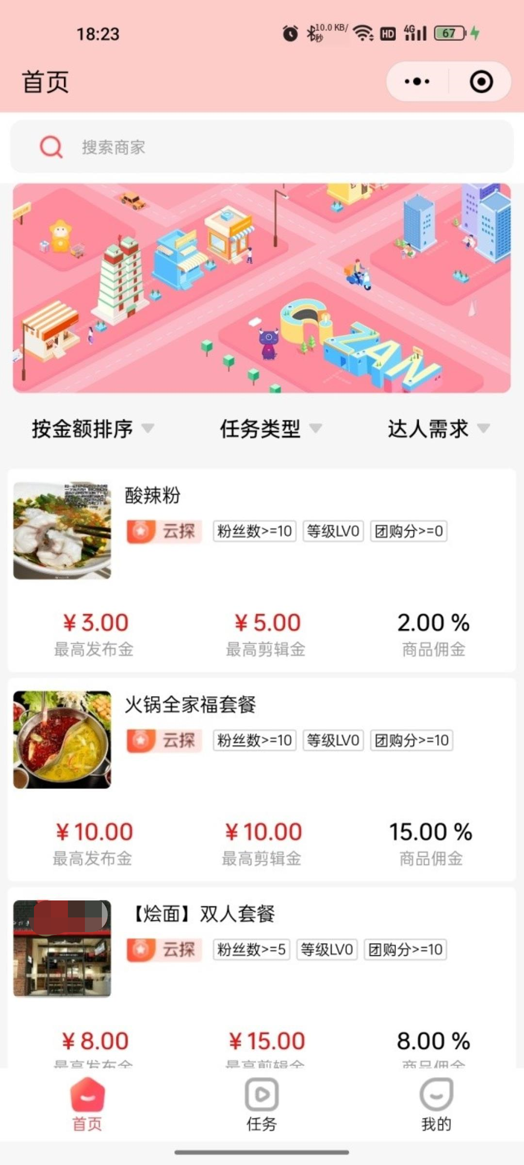 餐赞达人撮合平台,可以将签约商家的商品,以任务的形式上架到“撮合小程序”上,达人可以在小程序中直接领取任务,按照任务要求进行带货。通过一个平台,就可以获取不同等级达人信息,实现共同带货。
