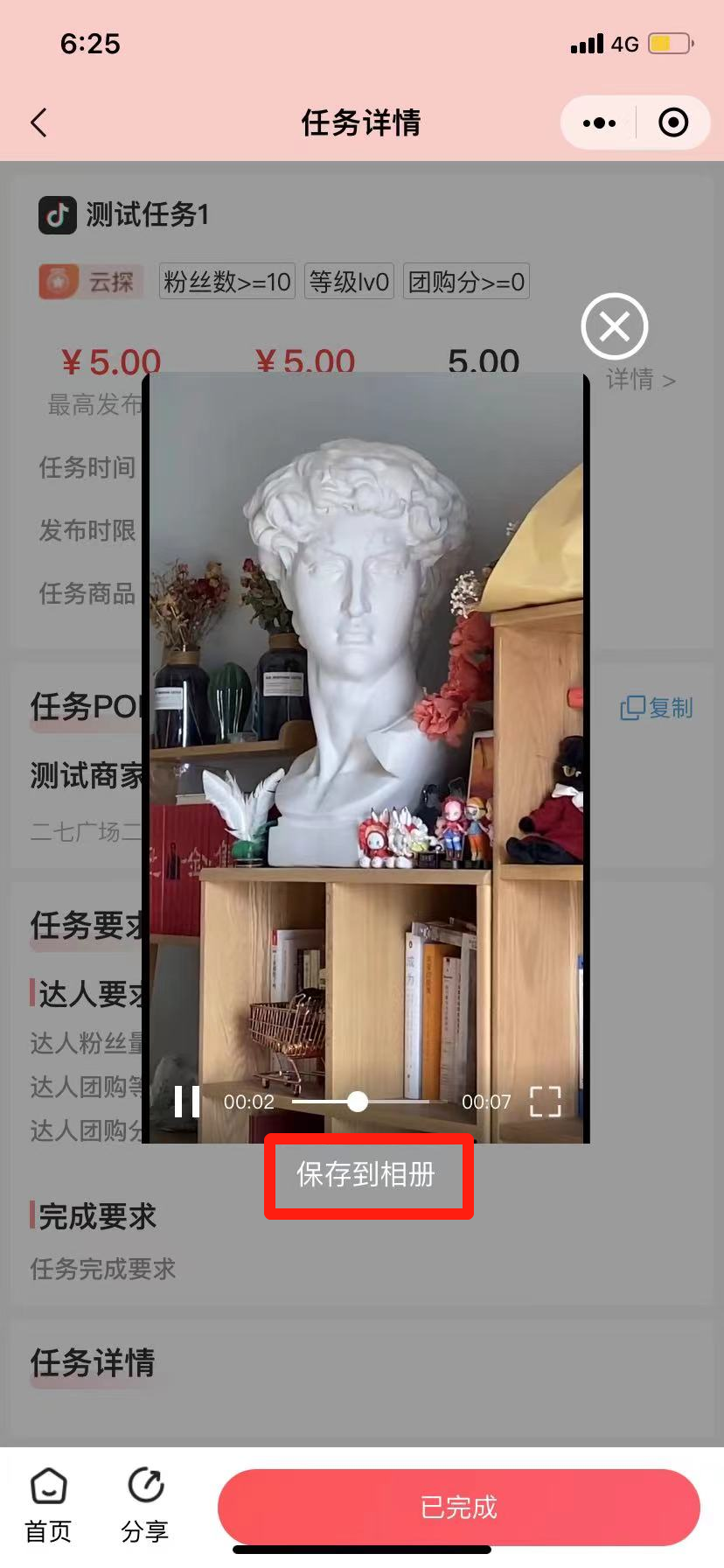 达人承接任务可下载视频发布至其他平台,满足更多推广需求。不仅能够实现短视频扫码发布,还可以将视频素材保存至本地相册,支持达人素材下载自创作,满足达人不同风格的发布需求。