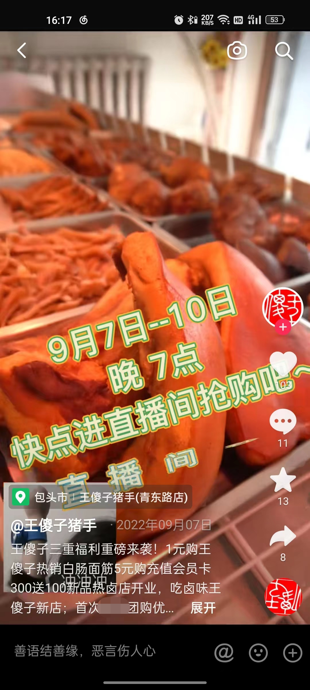 【王傻子猪手】商家会在自己的蓝V号进行直播,直播间会有多种福利产品,用户在直播间互动或者抢购后,需要到线下门店兑换和自提。