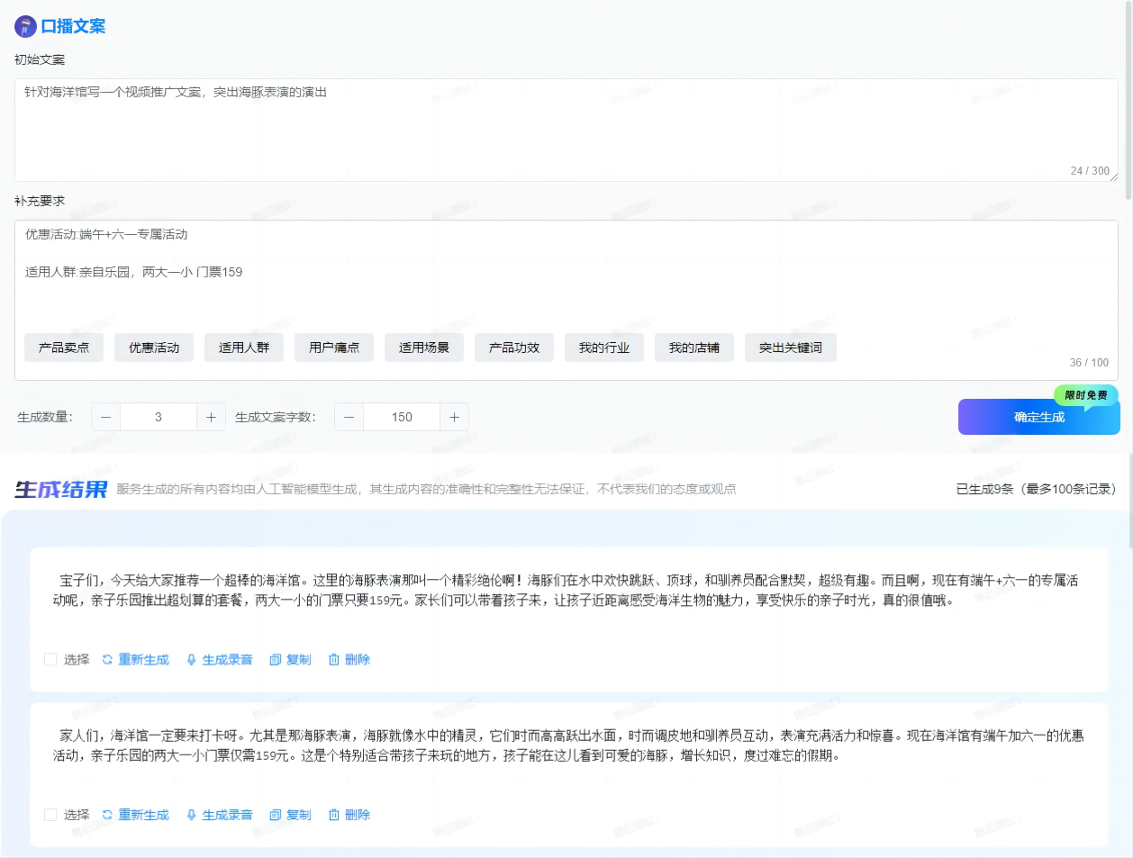 • 素材库搭建:商家上传海洋馆实景、动物表演片段等原始素材,AI自动识别,生成15-60秒的短视频,并适配各平台风格(抖音“卡点炫技”、小红书“攻略教程”)。
