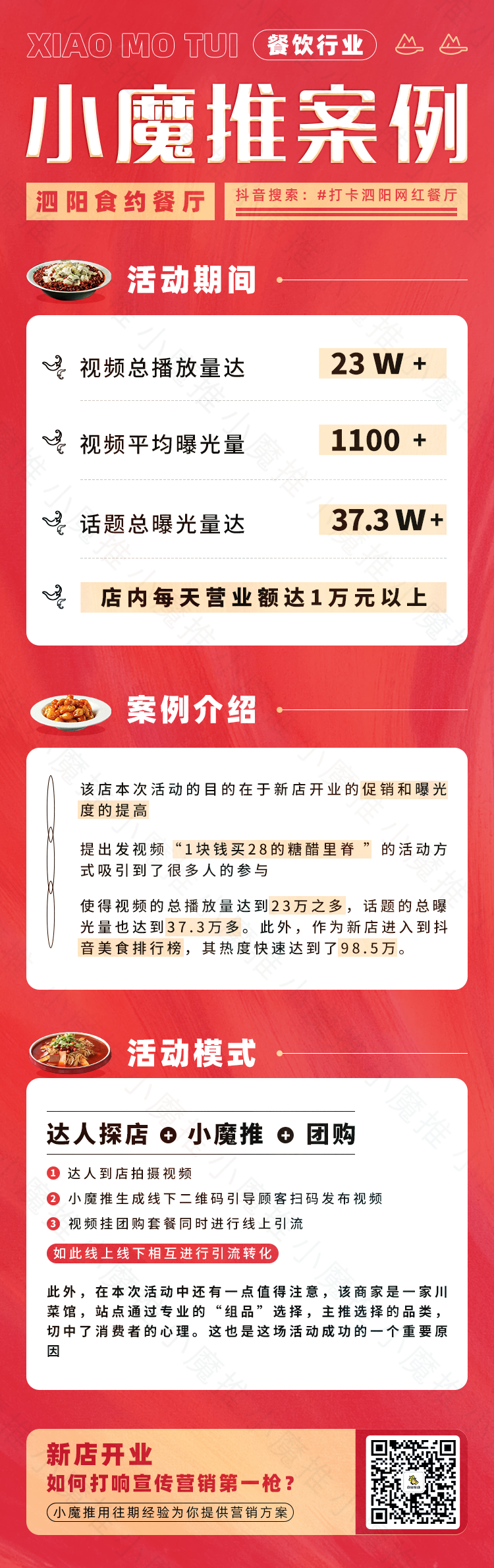 活动介绍:通过探店试吃菜品, 发现几个优质的产品,就主推这几个产品,通过小魔推推菜品商家店火爆,达到一天一万多的营业额。