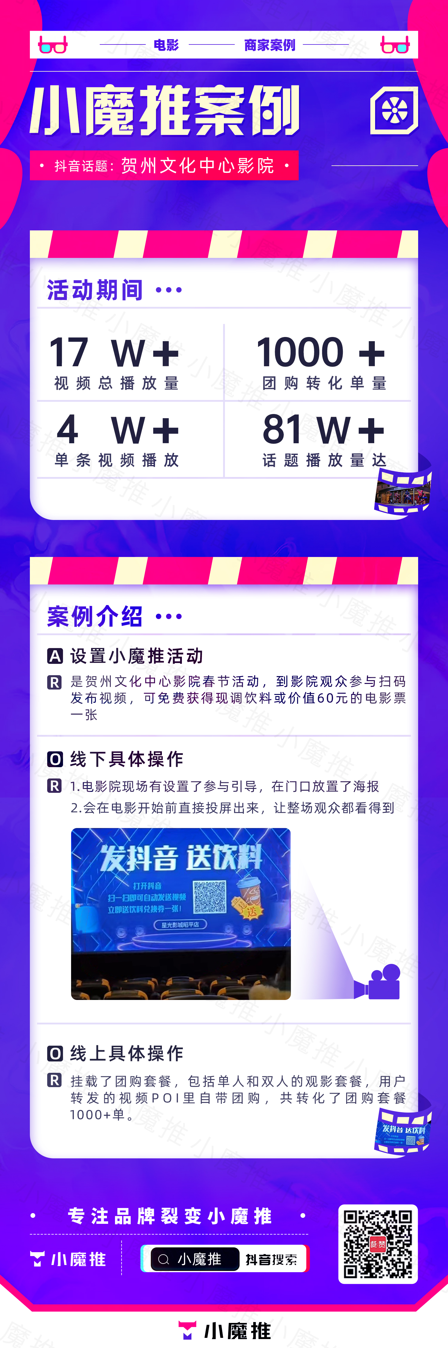 贺州文化中心影院设置的小魔推活动为贺州文化中心影院春节活动,到影院观众参与扫码发布视频,可免费获得现调饮料或价值60元的电影票一张。
