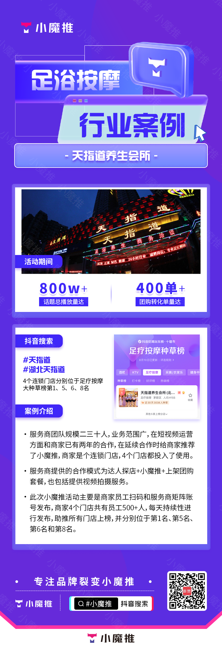 此次小魔推活动主要是商家员工扫码和服务商矩阵账号发布,商家4个门店共有员工500+人,每天持续性进行发布,助推所有门店上榜,并分别位于第1名,第5名,第6名和第8名。