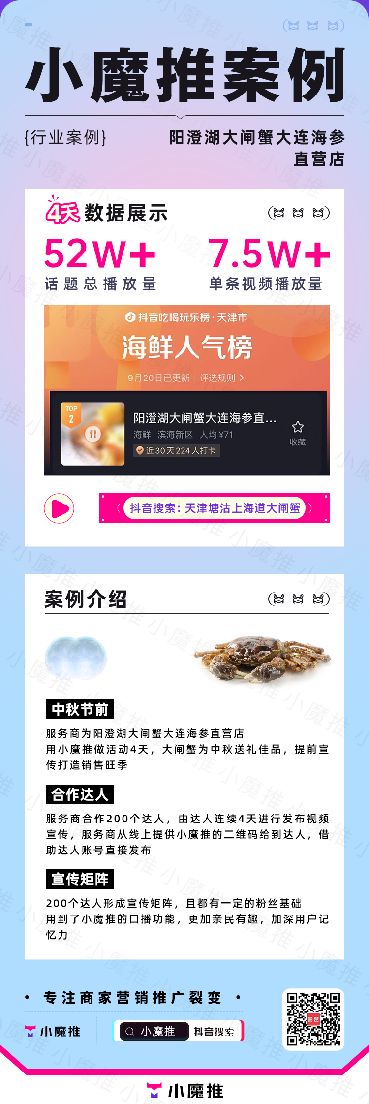 中秋节前,服务商为阳澄湖大闸蟹大连海参直营店用小魔推做活动4天,大闸蟹为中秋送礼佳品,提前宣传打造销售旺季。