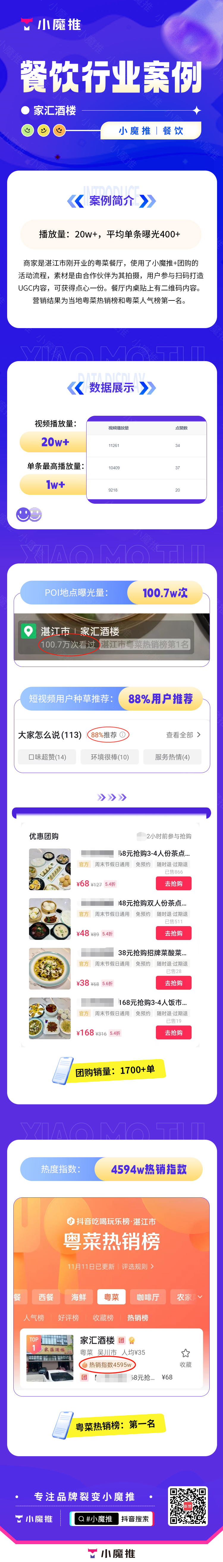 商家是湛江市刚开业的粤菜餐厅,使用了小魔推+团购的活动流程,素材是由合作伙伴为其拍摄,用户参与扫码打造UGC内容,可获得点心一份。餐厅内桌贴上有二维码内容。营销结果为当地粤菜热销榜和粤菜人气榜第一名。