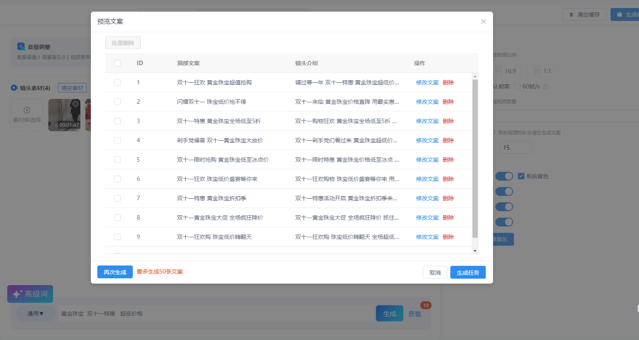 将拍摄的几十秒的视频素材上传至后台,比如门店的客流,黄金产品的展示、佩戴效果或者制作过程等,通过一键成片功能,输入关键词AI生成视频标题和文案,输入要生成的剪辑条数即可批量导出高质量成片视频。