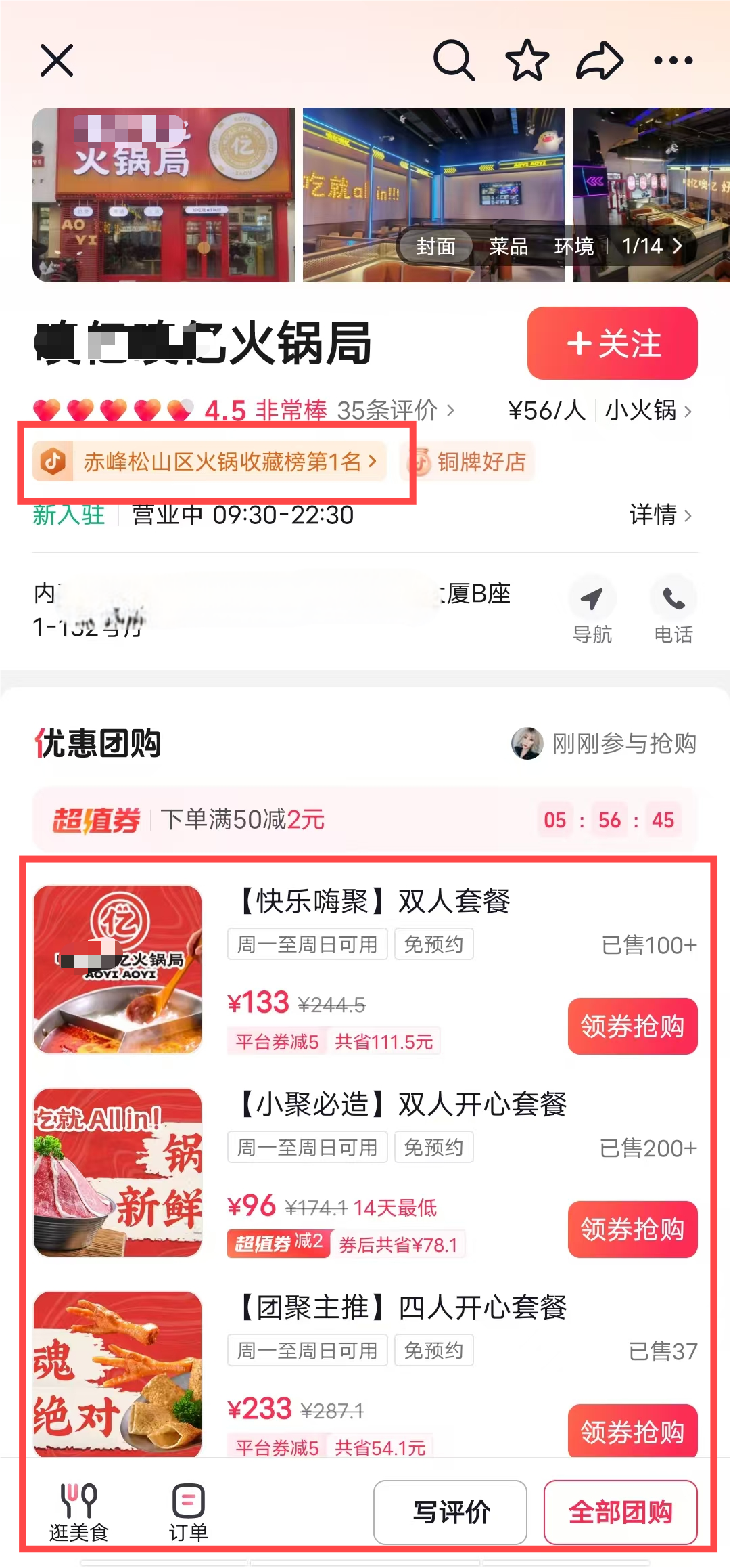 如此高的曝光度,让这家火锅店在抖音的本地火锅收藏榜中一举获得了第一名的佳绩。同时,高人气也带来了高转化,大量的顾客通过视频中的 poi 链接购买了团购套餐,带动了团购订单的转化,显著提升了门店的销售额。