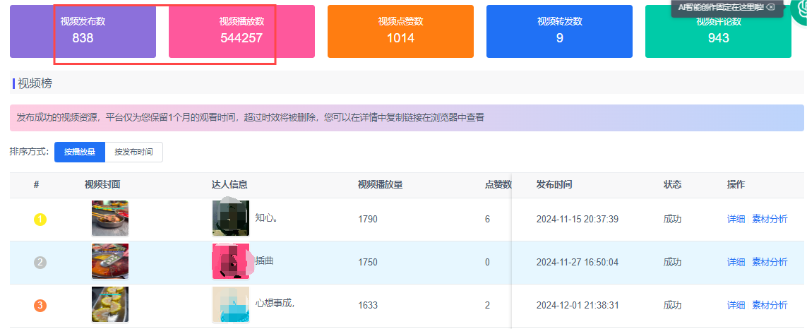 通过员工的账号授权发布以及顾客的扫码发布,火锅店总共获得了 838 条视频,这些视频在抖音平台上广泛传播,累计获得了 54.4 万的视频播放量。