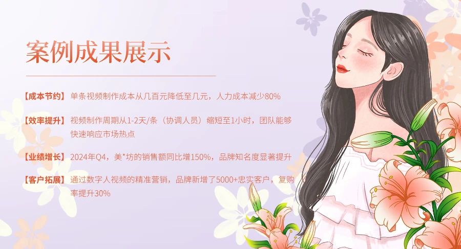 最终,“美*坊”通过小魔推数字人显著的成本效益、超高的制作效率、超强的内容定制、高转化的营销效果和操作便捷易上手的核心优势,取得了优秀的营销成果。“美*坊”的成功案例也充分证明了小魔推数字人在营销领域的巨大潜力。它不仅帮助品牌节省了成本、提升了效率,还通过高质量内容实现了业绩的显著增长。